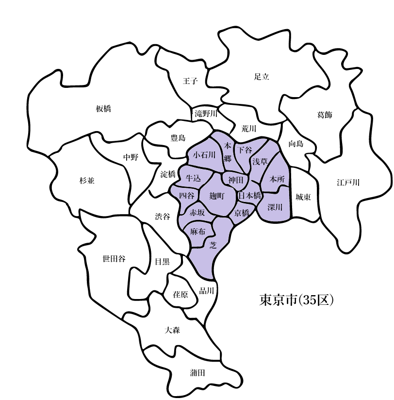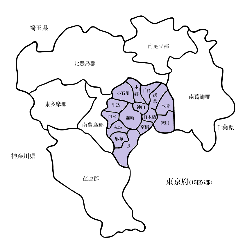 麹町区、神田区、日本橋区、京橋区、芝区、麻布区、赤坂区、四谷区、牛込区、小石川区、本郷区、下谷区、浅草区、本所区、深川区