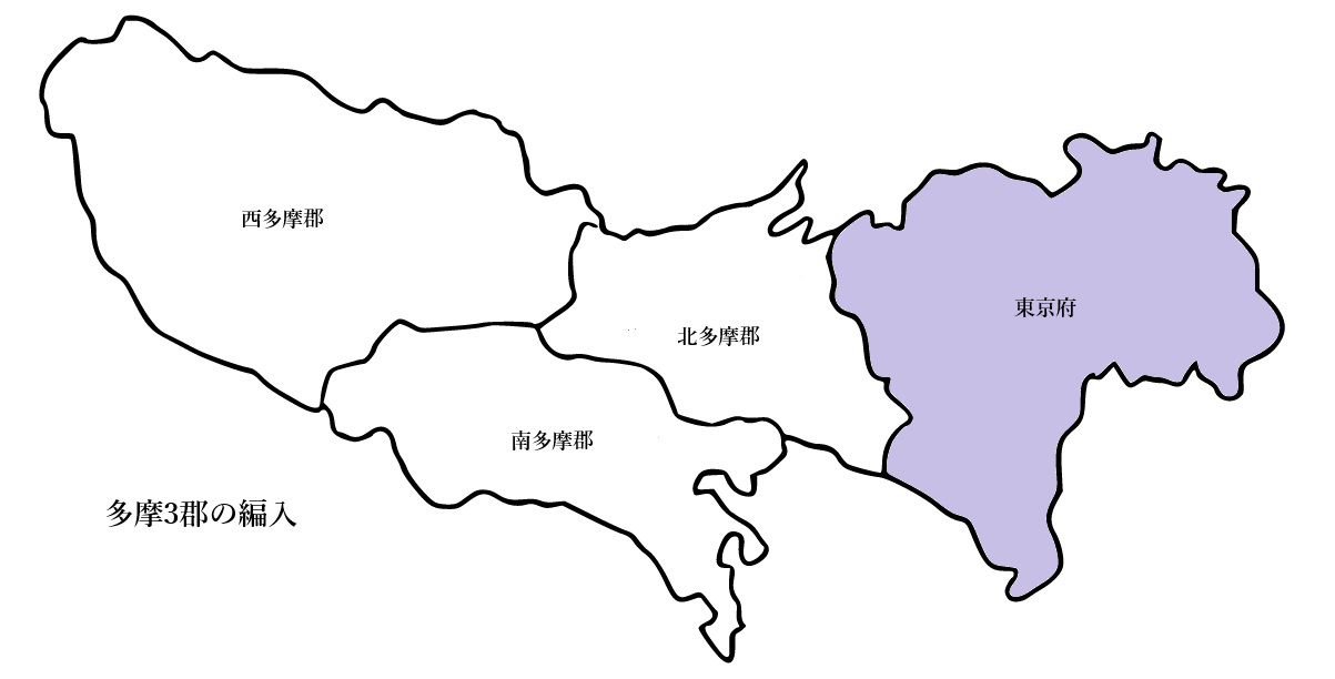 神奈川県から東京府へ3郡が東京府に移管され、現在の東京都の区域とほぼ同じ面積を持つようになります。・3郡